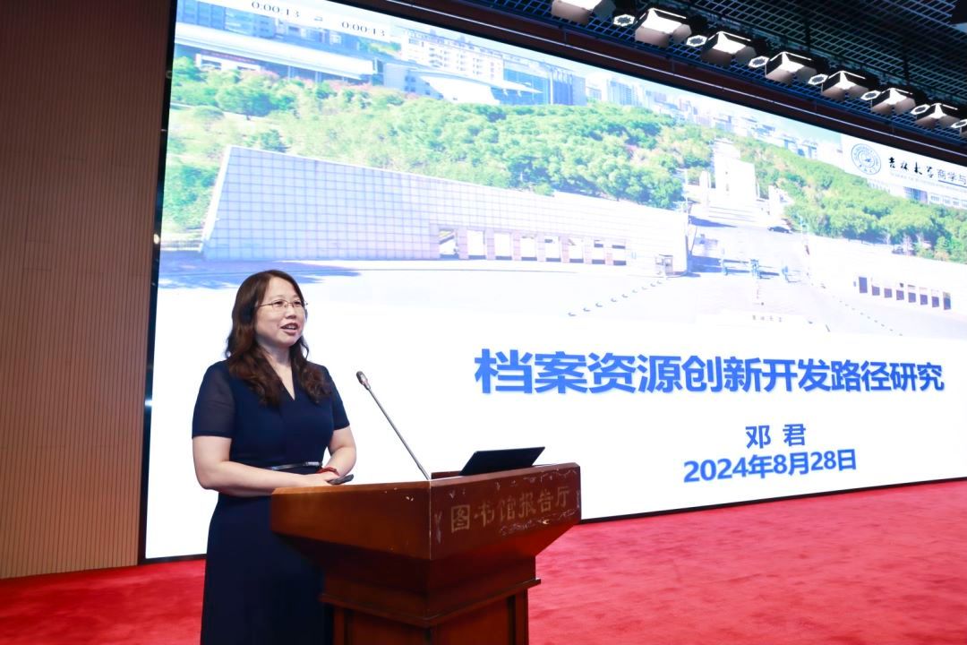 由苏州大学社会公司聂云霞教授主持,吉林大学商学与管理公司邓君教授作题为“档案资源创新开发路径研究”的主旨报告。邓君教授从广义和狭义两个方面揭示了档案资源创新开发的内涵,认为档案资源创新开发的“新”着重体现在思维之“新”、对象之“新”、形式之“新”、技术之“新”和服务之“新”等多方面。为此,提出以“档”资政,证史鉴今;以“档”育人,玉琢成器;以“档”筑基,引擎经济;以“档”兴文,引航文化的总体路径,推动档案资源创新开发,助力档案资源赋能新质生产力创新发展。
