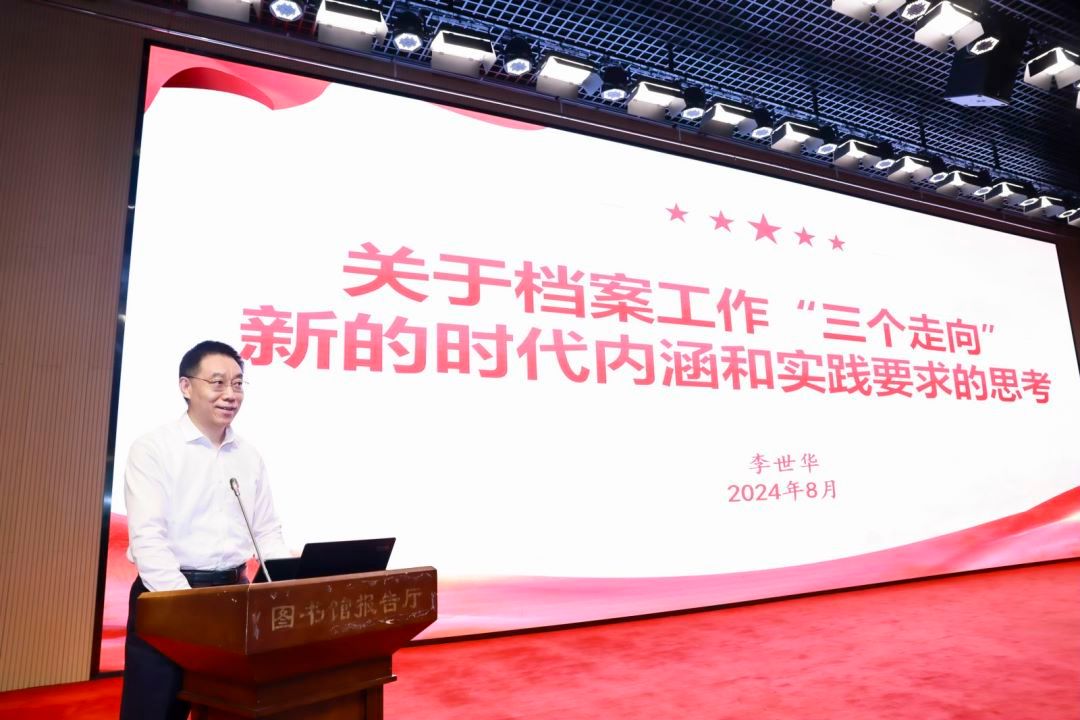 由山东大学历史公司赵爱国教授主持,山东省档案馆李世华馆长作题为“关于档案工作‘三个走向’新的时代内涵和实践要求的思考”的主旨报告。李世华馆长指出,在新的时代背景下,必须深刻领悟并践行“三个走向”的重要论述,即坚持党的领导走向依法治理、以人民为中心走向开放、以高质量发展走向现代化。通过总结新时代全面深化改革的经验,并结合山东档案工作实际,提出了创新性的“151”工作举措,为档案事业高质量发展提供了宝贵的经验与启示。