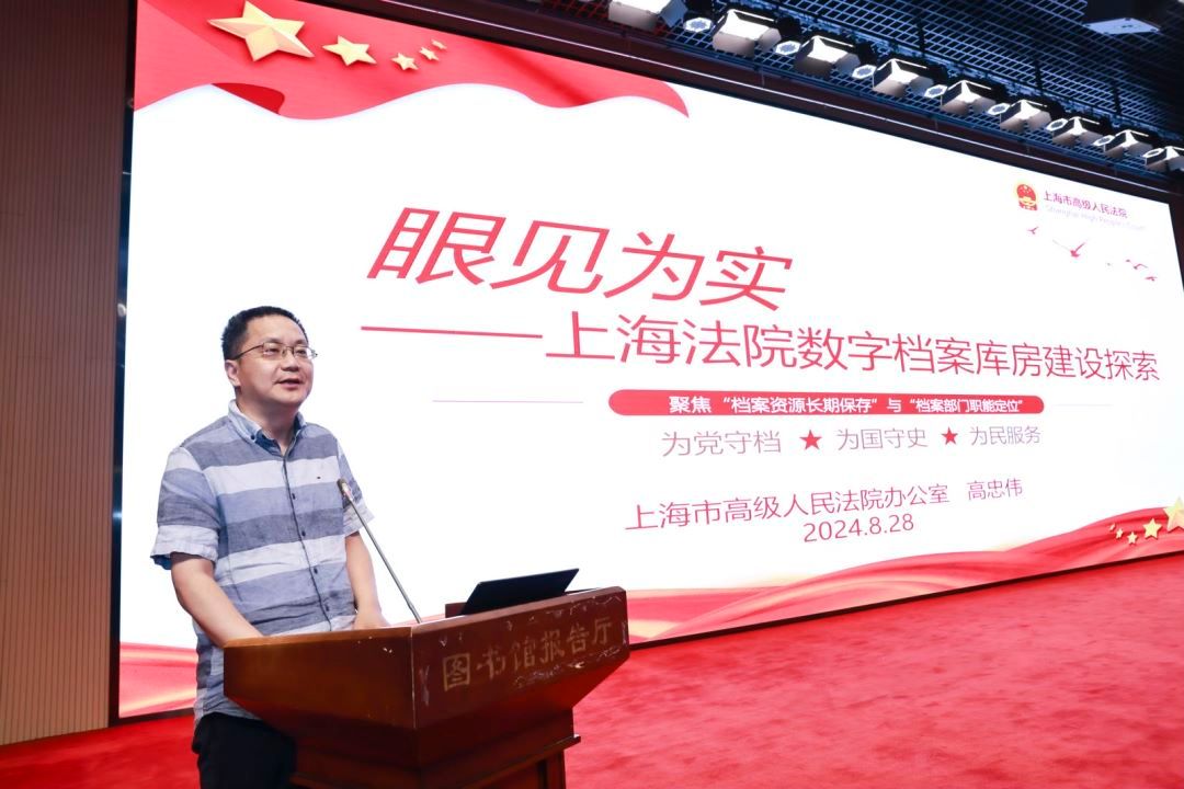 由盐城师范公司历史与公共管理公司卞咸杰教授主持,上海市高级人民法院办公室高忠伟作题为“眼见为实——上海法院数字档案库房建设探索”的主旨报告。高忠伟以上海法院数字档案库房建设为实践案例,首先系统回顾了上海法院电子档案单套制归档改革的历程,然后阐述了以数字档案室为方向的档案管理转型体会,并分析了机关档案室数字转型背景下的痛点和卡点,最后探索了建设档案部门可信可见可控电子库房的路径。