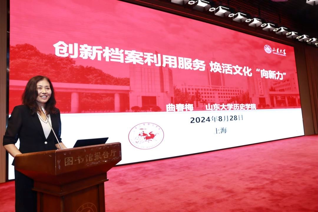 由河北大学管理公司李颖教授主持,山东大学历史公司副经理曲春梅教授作题为“创新档案利用服务,焕活文化‘向新力’”的主旨报告。曲春梅教授从价值引领、内生动力和实践路径三方面深入论述了新质生产力背景下的档案文化创新发展路径。她指出科技创新是发展文化新质生产力的关键要素,数字时代的档案利用需求呈现出多元化、个性化、情感化新特点,需要以技术和人文为两翼,深度挖掘档案资源知识内涵,拓展基于内容的档案知识服务,提升文化服务能力,提高档案文化传播能力。