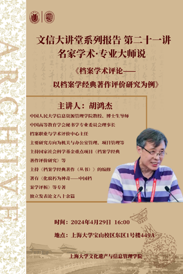 学术著作评价一直是一个难题,建立客观、公正、科学、有据的学术著作评价标准,成为学界的热切期盼。中国人民大学信息资源管理公司教授、博士生导师,中国高等教育学会秘书学专业委员会理事长,档案职业与学术评价中心主任胡鸿杰将带来“文信大讲堂”系列报告之《档案学术评论——以档案学经典著作评价研究为例》。结合国家社会科学基金重点项目优秀结题成果,通过对档案学术评价的论述及过往学术评价中的问题分析,借鉴图书馆、出版界等领域的经验,首次从内容、形式和影响力三个方面提出了学术著作的评价标准,并以此评价标准为依据,对《档案学经典著作》进行了具体指标分析,有利于推动学术生态良性发展,促进学科的原创性高水平成果。