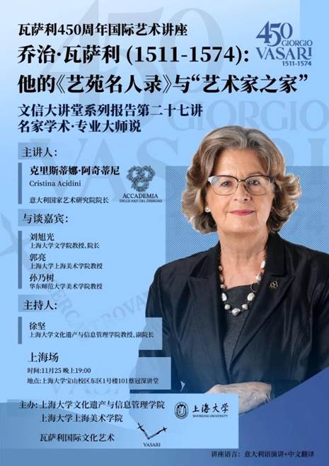 乔治·瓦萨利是16世纪意大利著名画家、建筑师和美术史家,因撰写《艺苑名人录》而闻名于世,书中记录了艺术及艺术家的发展历史,并且第一次提出文艺复兴一词,对后来的艺术理论研究有深刻影响。讲座由意大利国家艺术院经理Cristina Acidini在瓦萨利450周年之际,分享关于瓦萨利的《艺苑名人录》与“艺术家之家”的话题,讲述意大利艺术发展史,从乔托到米开朗琪罗,直至瓦萨利本人。
