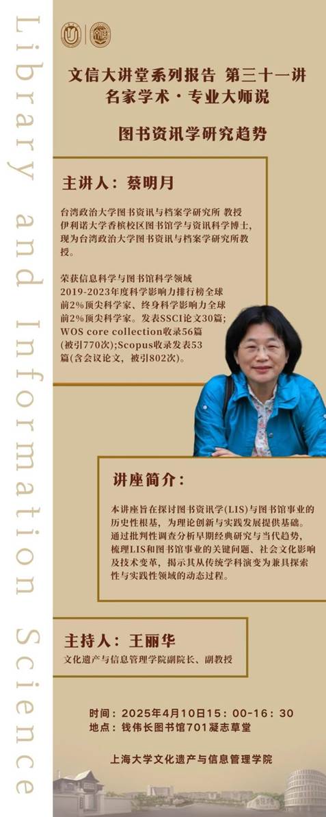 蔡明月,伊利诺大学香槟校区图书馆学与资讯科学博士,现为台湾政治大学图书资讯与档案学研究所教授。荣获信息科学与图书馆科学领域2019-2023年度科学影响力排行榜全球前2%顶尖科学家、终身科学影响力全球前2%顶尖科学家。发表SSCI论文30篇;WOS core collection收录56篇(被引770次);Scopus收录发表53篇(含会议论文,被引802次)。