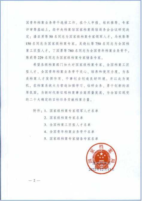 此次选拔“国家级档案专家、全国档案工匠型人才和全国青年档案业务骨干”人才队伍,是国家档案局以习近平总书记关于档案工作和人才工作重要指示批示精神为指导,以“十四五”时期档案事业发展对人才的需求为导向,以建设结构合理、数量充足的人才队伍为目标,不断加快档案系统人才队伍建设的重要举措,对推进新时代全国档案事业高质量发展具有重要意义。共计在全国范围内遴选出50名国家级档案专家领军人才、150名国家级档案专家、750名全国档案工匠型人才、780名全国青年档案业务骨干。这些人才将为档案事业发展提供决策支持和人才支撑,开启新时代人才强档工程。