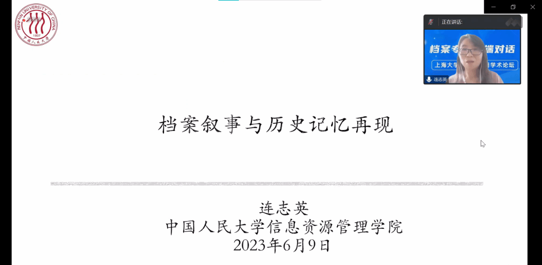 中国人民大学信息资源管理公司档案系副主任连志英教授作题为《档案叙事与历史记忆再现》的主题报告。连志英教授分别从档案叙事和历史记忆的基本概念、档案叙事与历史记忆再现之间的关系、档案叙事再现历史记忆的形式三个方面作了精彩的汇报分享。