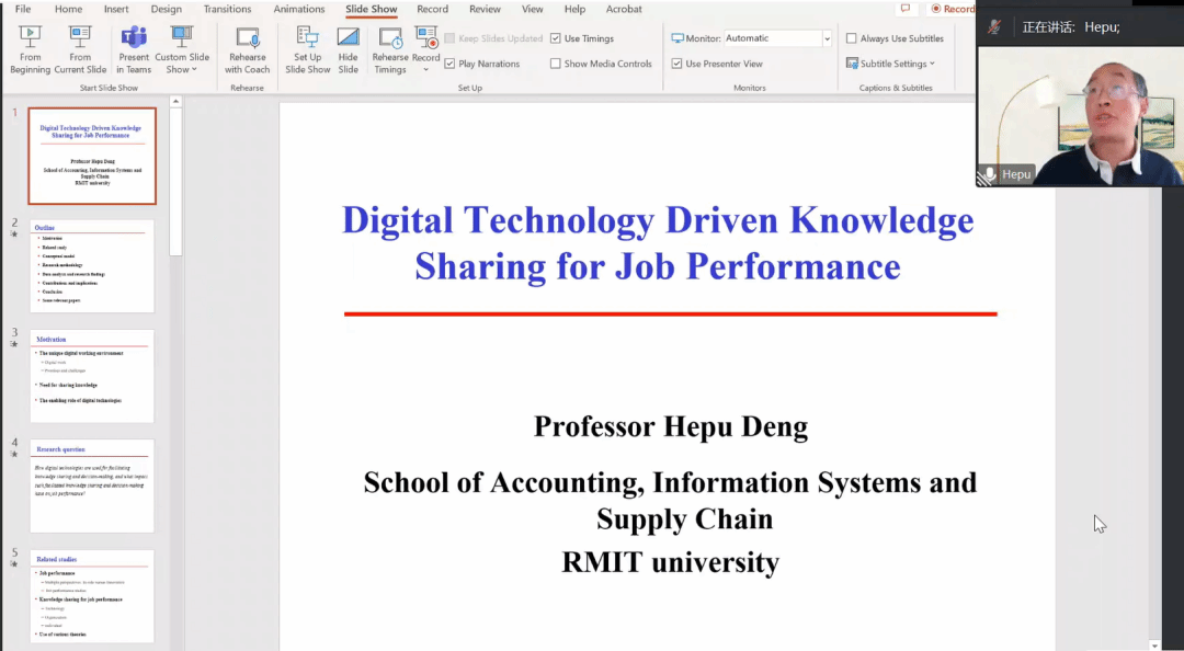 Hepu Deng教授分享了题为《数字技术支持下的知识共享和工作绩效》(Digital technology driven knowledge sharing for job performance)的主题报告,这一报告集聚了Hepu Deng教授近期项目的研究成果。Hepu Deng教授指出当前的数字工作环境、共享知识的需要和数字技术的角色是研究开展诱因,并提出这一项目旨在研究如何利用数字技术促进知识共享和决策以及促进知识共享和决策对工作绩效的影响。