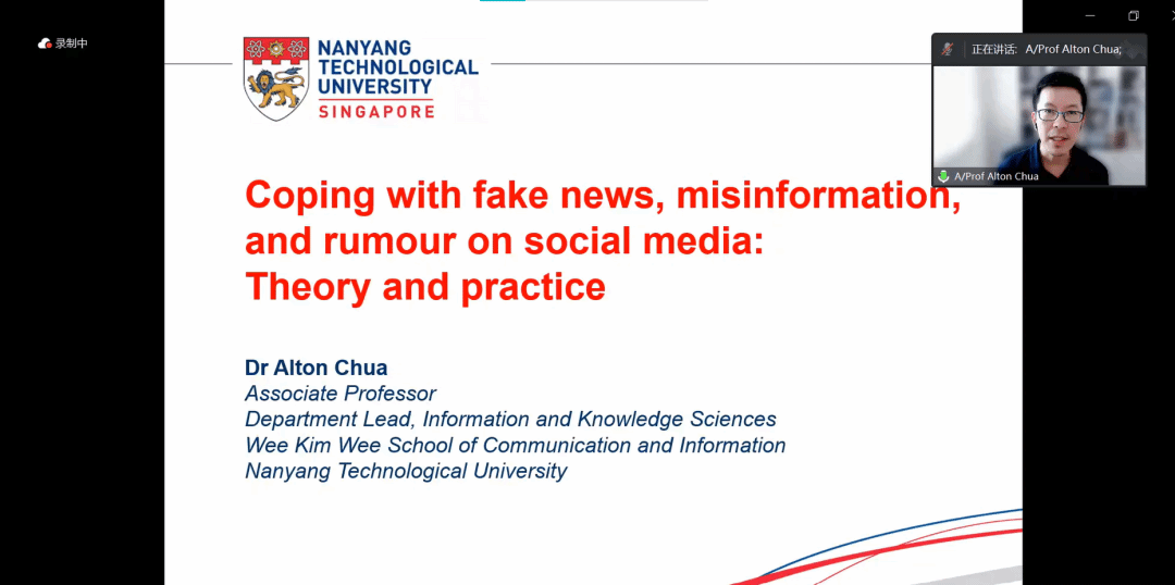 新加披南洋理工大学黄金辉传播与信息公司经理聘副教授兼任信息与知识学科系主任Alton Chua分享题为《应对社交媒体平台上的假新闻、虚假信息和谣言:理论与实践》(Coping with fake news,miinformation and rumor on social media:theory and practice)的主题报告。Alton Chua教授从如何判断网络信息的真假,普通用户是否会传输网络信息以及网络信息的分享范围三个方面做了精彩的报告。