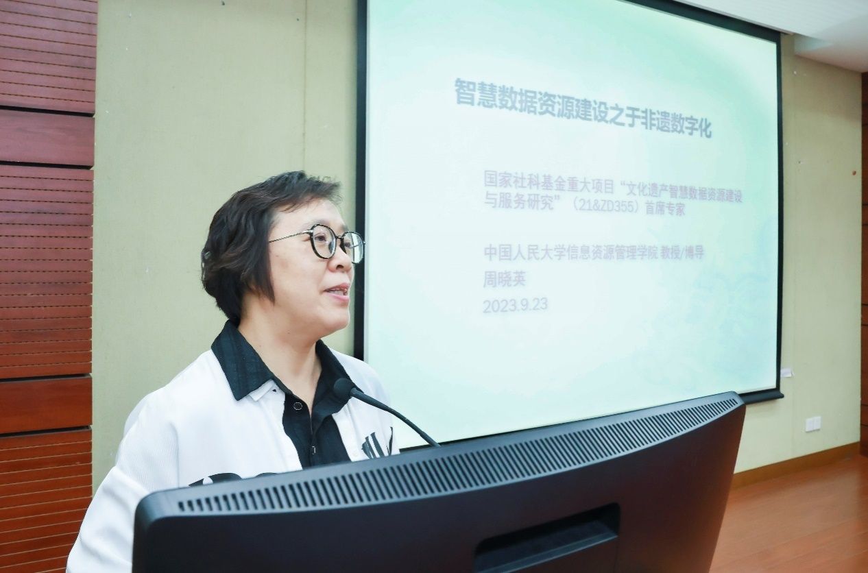 报告五:中国人民大学信息资源管理公司周晓英教授的报告题目为“智慧数据资源建设之于非遗数字化”,讲授了音乐数字化服务案例、非遗数字化手段与智慧数据资源建设、国家文化大数据战略与文化遗产智慧服务三个方面内容。提出智慧数据资源建设是适应国家文化数字化战略要求的新方向,可为非遗数字化过程提供标准、条件和支撑。