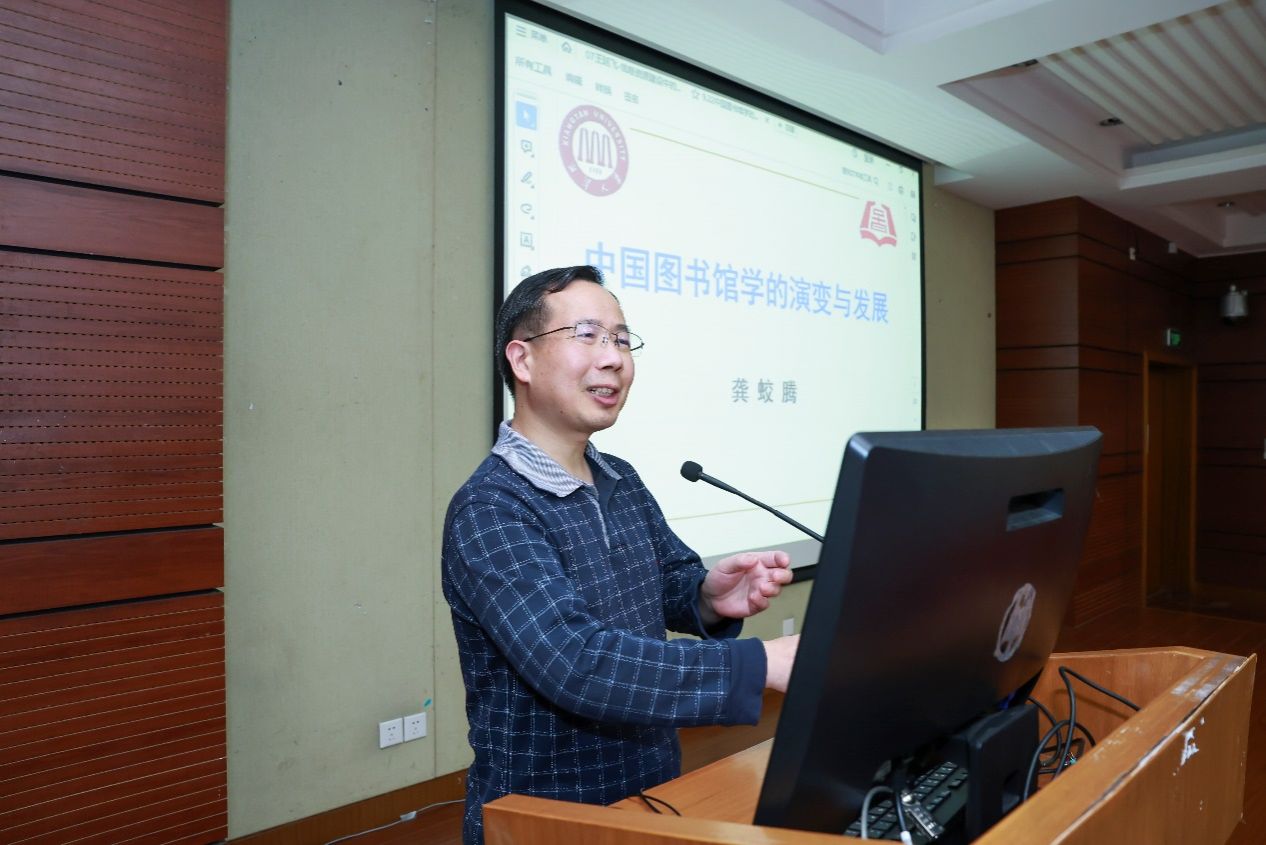 报告十:湘潭大学图书馆馆长龚蛟腾教授的报告题目为“中国图书馆学的演变与发展”,讲授了中国图书馆学的起源与转型、中国图书馆学的交流与竞合、中国图书馆学的创新与发展三方面内容,提出图书馆学的变革与趋向是实质化、本土化、世界化和大众化。