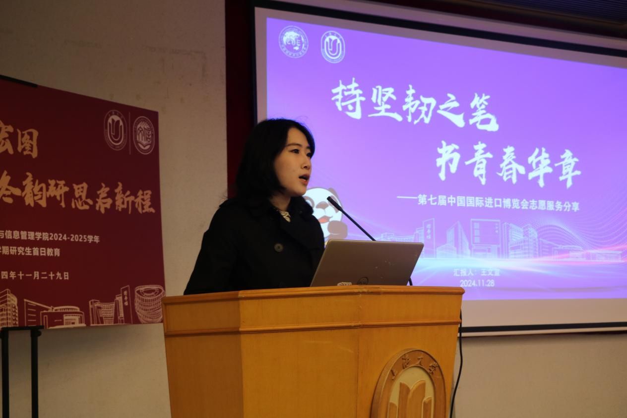 2023级档案学专业硕士研究生王文宣分享担任第七届中国国际进口博览会志愿者的经历与感悟。首先,她介绍了进博会志愿信息的相关发布平台;其次,她分享志愿者面试经验,建议文信研究生以条理清晰的语言表达逻辑来充分展现自身能力和志愿经验优势;最后,她展示进博会期间的志愿者工作日常,表示在志愿服务过程中不仅了解到国内外的贸易产品与历史文化,更与来自各个高校的“小叶子”们建立了宝贵友谊。