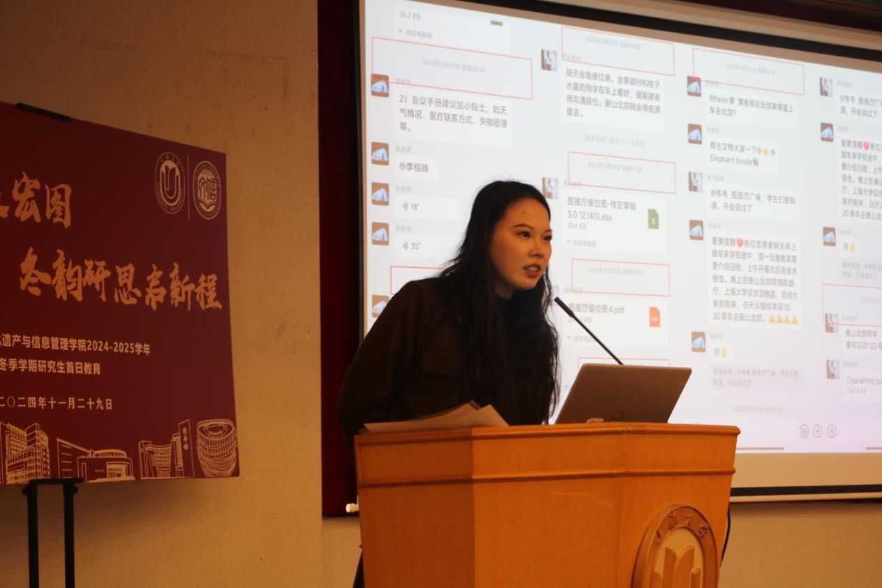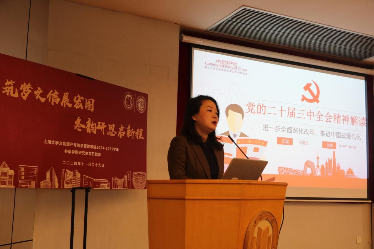 冬风悄卷,新程又启。作别秋季学期的忙碌与充实,我们一同迎来了大有可为的冬季学期。为使公司研究生更好地开启冬季学期新征程,2024年11月29日上午,2024-2025学年冬季学期“筑梦文信展宏图,冬韵研思启新程”研究生首日教育在宝山校区行政楼报告厅顺利举行。304am永利集团公司党委副书记、副经理韦淑珍,挂职副经理、考古学与博物馆学系副主任黄洋,团委副书记、研究生辅导员张玉昭,团委副书记、研究生辅导员杨倚天出席会议,2023级、2024级全体研究生参加会议,会议由公司研究生党总支副书记闫欢欢主持。