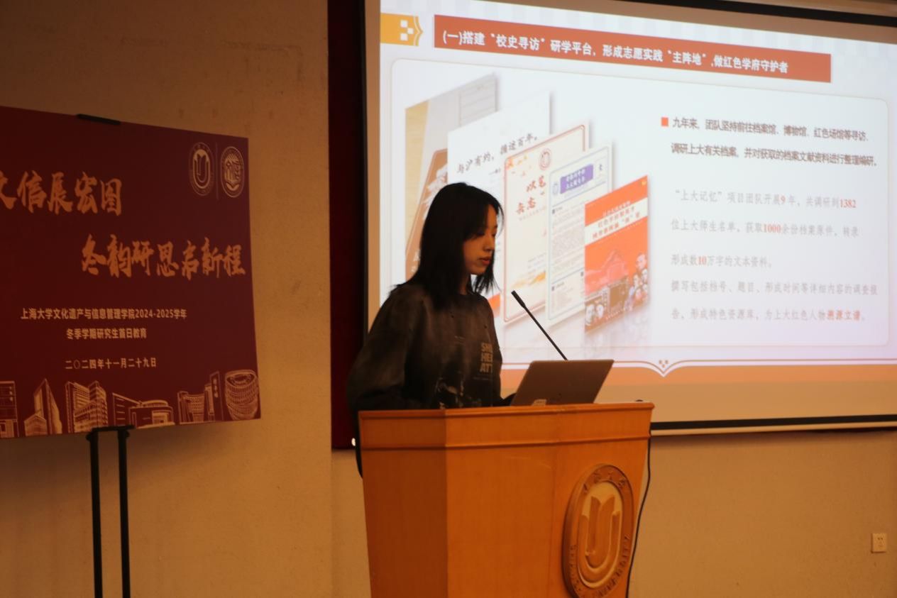 2023级档案学专业硕士研究生闫欢欢一方面以第五届世界考古论坛的会议筹划为例,介绍成为重大会议志愿者应具备的素质条件,建议文信研究生注重积累员工工作和志愿服务经历;另一方面,她介绍中共一大纪念馆志愿讲解服务的相关情况,该文信品牌活动为文信学子赓续红色基因、展现青春风貌提供良好的平台,她号召更多的文信研究生能够加入讲解队之中,成为红色基因的传承人。