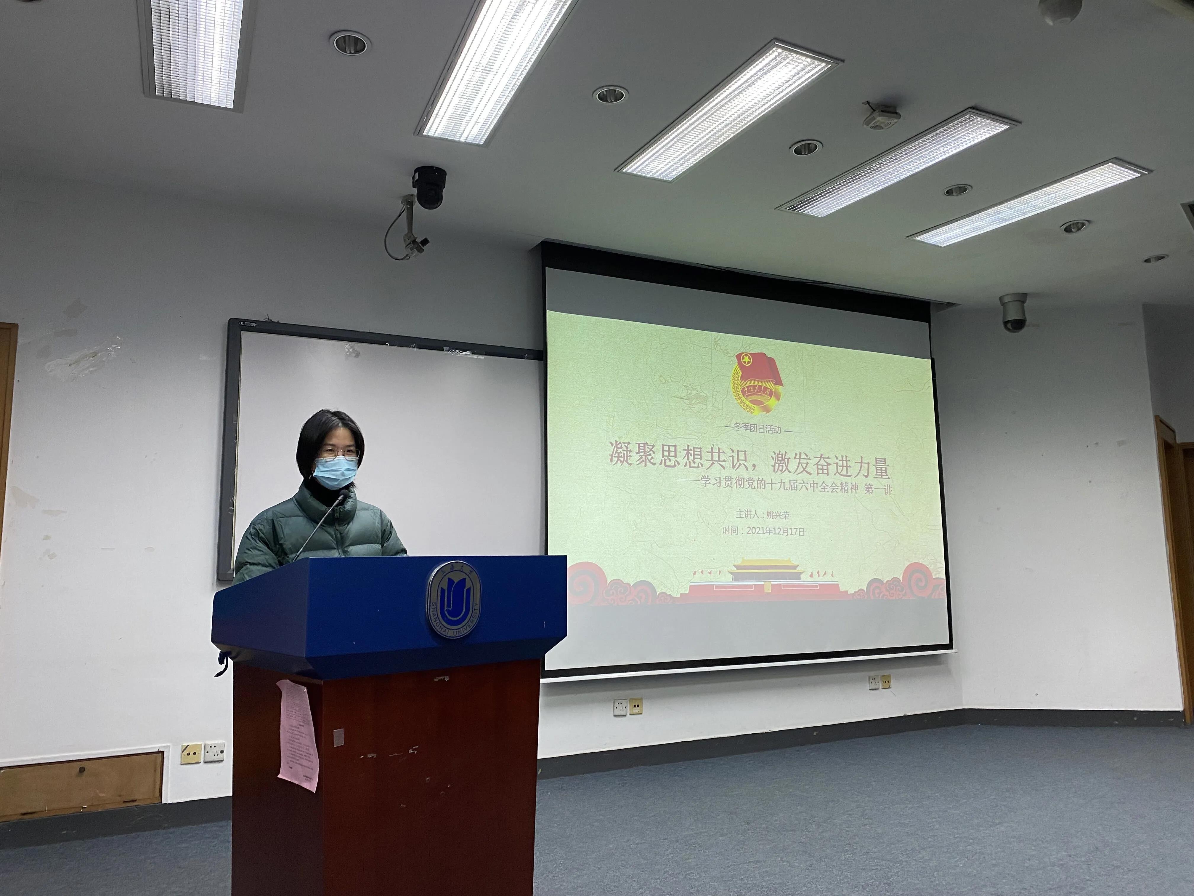 系员工会主席、19级档案班团支部副书记姚兴荣同学以“凝聚思想共识,激发奋进力量”为题,首先向大家解释了党的全国代表大会、党的中央全会的基本知识,再带领支部成员回顾四个历史时期、四个伟大飞跃,共同学习马克思主义中国化的三次飞跃和两个确立。并带领支部成员从十个“明确”、十三个方面、五个方面、十个“坚持”、一个根本问题、一个号召精读十九届六中全会精神。增强了支部成员的政治意识、坚定了支部成员未来的发展方向和目标、看清了自己的使命和担当。