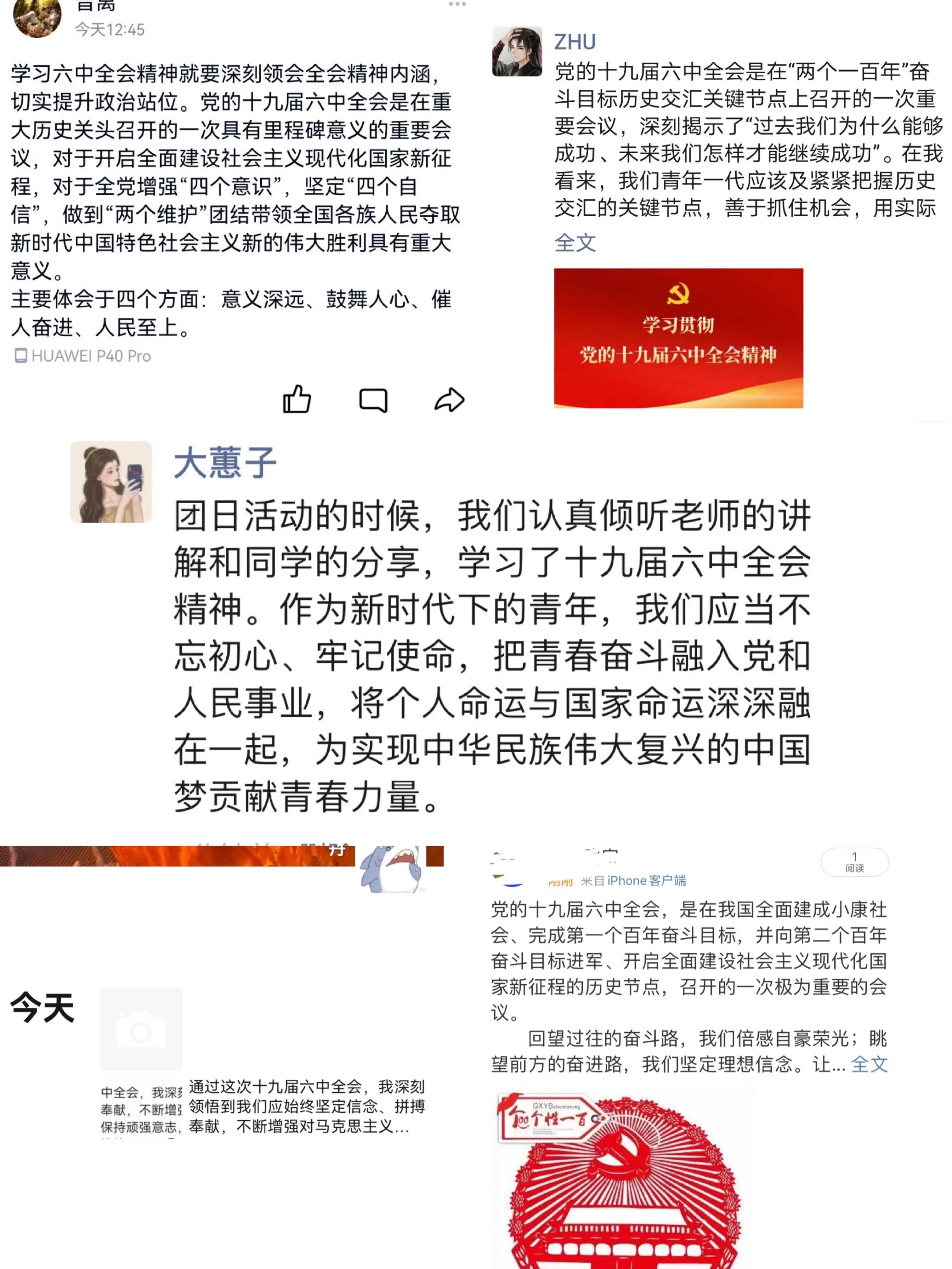 在经过较为全面地学习了十九届六中全会精神后,同学们将自己化为主讲人,进一步深入学习党史、传播党史、赓续红色基因,以及深刻感悟赢得更加伟大胜利和荣光的时代使命,进行自我反思与课外学习,充分利用各大社交平台和媒介分享自己的学习感悟,营造良好的党史学习氛围,且扩大了团日活动的影响力。