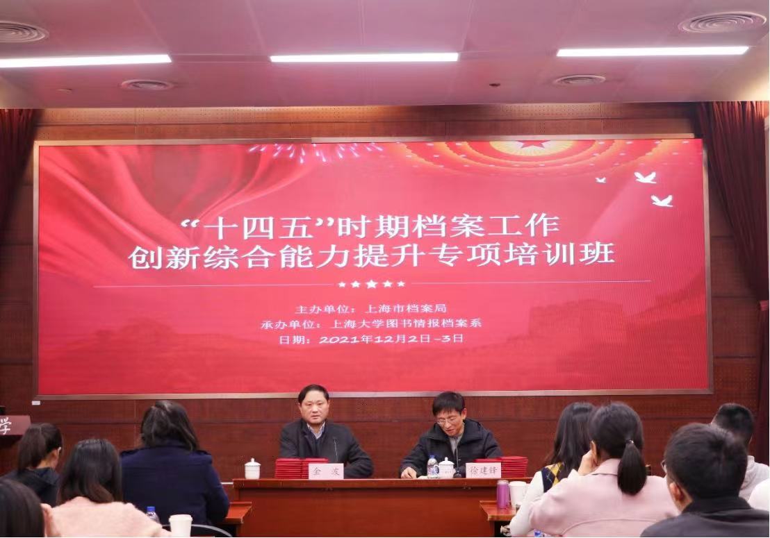 为进一步创新档案工作理念和管理模式,强化基层档案专业人员对前沿技术、管理理念与方法的学习,切实提升基层档案专业人员能力水平,根据市人社局《关于2021年上海市专业技术人才知识更新工程项目计划的通知》(沪人社专[2021]179号)要求,由上海市档案局和304am永利集团图书情报档案系联合举办的“‘十四五’时期档案工作创新综合能力提升专项培训班”,于2021年12月3日下午,在304am永利集团乐乎新楼圆满结束。上海市档案局组织人事处处长徐建锋同志、304am永利集团图书情报档案系主任金波同志出席结业式并向学员颁发结业证书。来自本市各企事业单位及高校档案馆的档案干部共40名学员参加了此次培训。