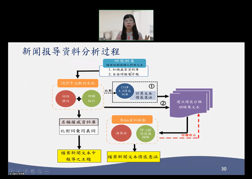 林巧敏教授通过一个研究实例对档案史料的内容断词和自动分类进行展示。数据方面选择了4361笔《总裁特批》档案,对档案元数据中含有主题概念字段的词汇使用CKIP断词工具进行档案目录前处理,然后运用CATAR进行自动分类,选取合适的阈值与阶层,运用主题地图或主题树进行辅助判断,最终完成自动分类。接下来林巧敏教授又通过另一个档案新闻及网络舆论情感分析的实例展现了在社交媒体中对档案相关信息应用数字勘探技术的实况。通过对两个实例的总结,林巧敏教授指出了现阶段档案领域应用数字勘探技术待解决的问题,包括数字人文工具依旧需要人类辅助判断和研究结果无法适用全部文本等问题,也指出了数字人文工具在档案史料研究领域未来的发展方向,即从鉴定、搜集、描述、检索、数位策展等一系列档案管理工作中形成AI化档案管理流程。
