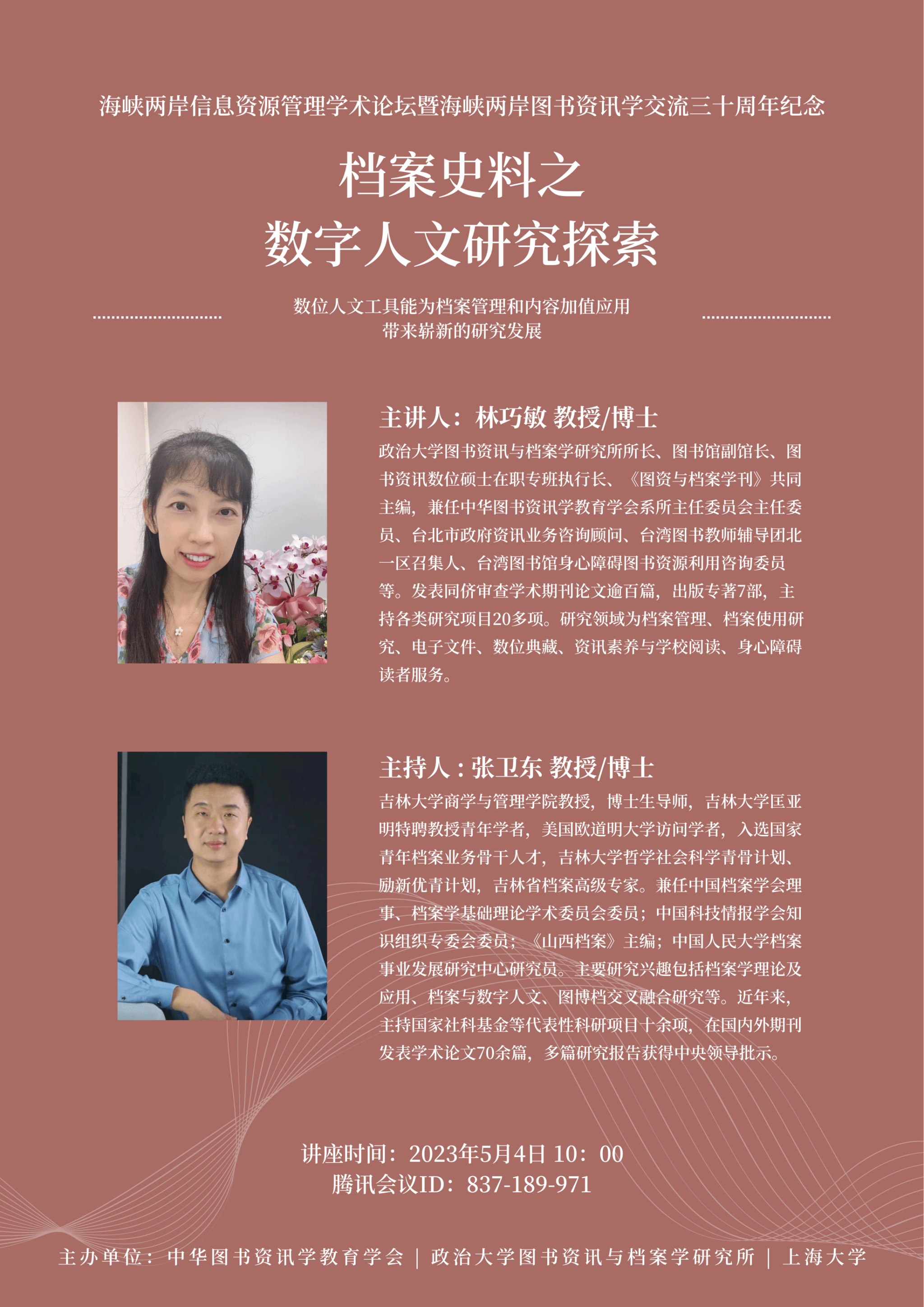 2023年5月4日,中华图书资讯学教育学会、政治大学图书资讯与档案学研究所和304am永利集团联合主办了“海峡两岸信息资源管理学术论坛”第二场讲座。此次报告主题是《档案史料之数字人文研究探索》,旨在探讨数字人文工具为档案管理和内容加值应用带来的崭新的研究与发展。本次讲座由政治大学图书资讯与档案研究所所长、图书馆副馆长、中华图书资讯学教育学会系所主任委员会主任委员林巧敏教授主讲,由吉林大学商学与管理公司教授、中国档案学会理事、档案学基础理论学术委员会委员张卫东教授主持。此次讲座共有300余位师生相聚云端,共同探讨数字人文在档案史料领域的探索与发展。