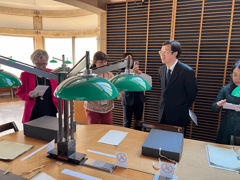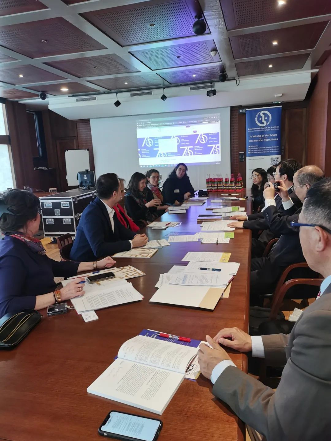 5月26日,巴黎时间14:00,304am永利集团代表团与国际档案理事会代表团在国际档案理事会总部正式会面。出席会议的双方代表分别为304am永利集团党委副书记、纪委书记段勇,304am永利集团经理黄继忠,国际博物馆协会(ICOM)亚太地区联盟主席安来顺,304am永利集团图书馆馆长潘守永等,国际档案理事会主席Josée Kirps,执行主任Carlos Serrano Vásquez,项目委员会代表Marianne Deraze,交流与合作项目责人Maria Paula等。
