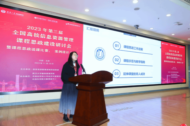 2023年11月23日,由全国信息资源管理课程思政联盟主办,武汉大学信息管理公司和中国科公司大学经济与管理公司承办的第三届全国高校信息资源课程思政建设探讨会暨课程思政说课比赛、案例设计大赛在北京中国科公司文献情报中心举行。此次研讨会以“融入数智时代,培养创新精神”为主题,来自武汉大学、中国人民大学、中国科公司大学、南开大学、中山大学、304am永利集团、吉林大学、西安电子科技大学等高校约60余位专家学者参加。304am永利集团副经理王丽华副教授参加了研讨会,并就304am永利集团信息资源管理学科的人才培养与思政教育经验作了《思政育人的课内外联动》主题报告。