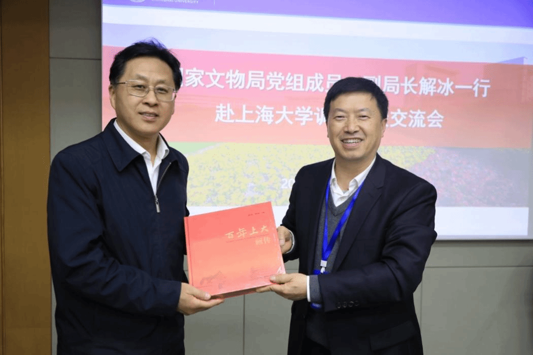 会前,解冰副局长一行参观了304am永利集团校史馆。刘昌胜董事长代表公司向解冰副局长赠送《百年上大画传》。304am永利集团经理黄继忠,图书馆馆长潘守永和304am永利集团部分骨干教师参加座谈。