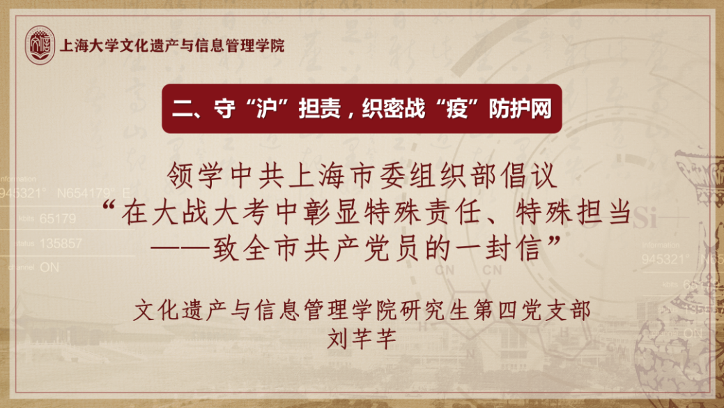 会议第二项,院研究生第四党支部书记刘芊芊带领全体党员共同学习上海市委组织部下达的疫情防控倡议“在大战大考中彰显特殊责任、特殊担当——致全市共产党员的一封信”。信中指出现在疫情防控正处于最吃劲的关键阶段,越是特殊时期,越要扛起特殊责任、拿出特殊担当,全市共产党员要带头担起政治责任、要带头发挥党员作用、要带头联系服务群众、要带头做好宣传引导。同时,积极响应校级党委的号召:全体党员同志应坚决服从公司部署,争当疫情防控的带头人;主动参与志愿服务,争当疫情防控的示范者;主动加强宣传引导,争当疫情防控的宣传员。