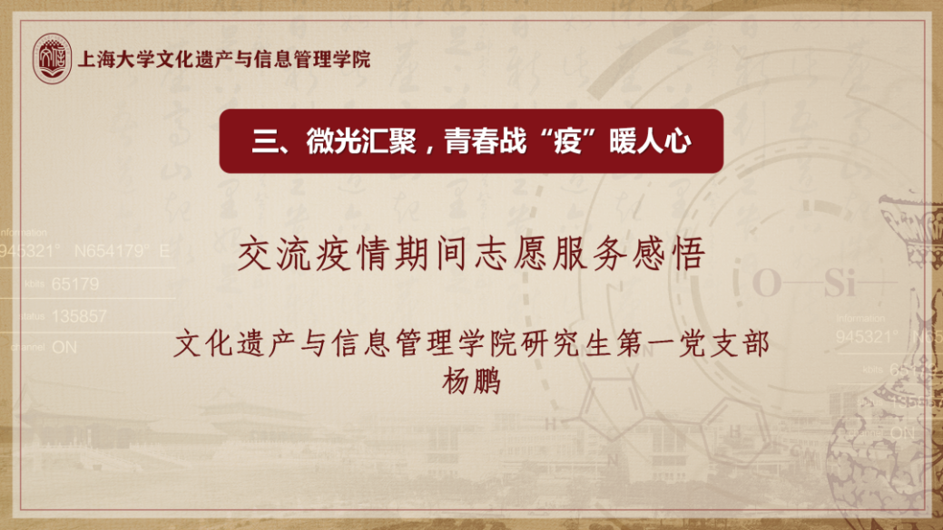会议第三项,院研究生第一党支部党员杨鹏述说了疫情期间他的特殊志愿服务经历。杨鹏同志主动参与到公司封控楼栋的志愿服务中,服务期间,他作为机动组组长,为封控楼栋的两百多名员工递送分发饮用水、药品、纸巾等生活物资。尽管服务期的条件有限,但杨鹏同志敢于付出,乐于奉献,并表示最大的感受就是要感激生活、珍惜当下,充分展现了一名党员、一名文信人的责任与担当。