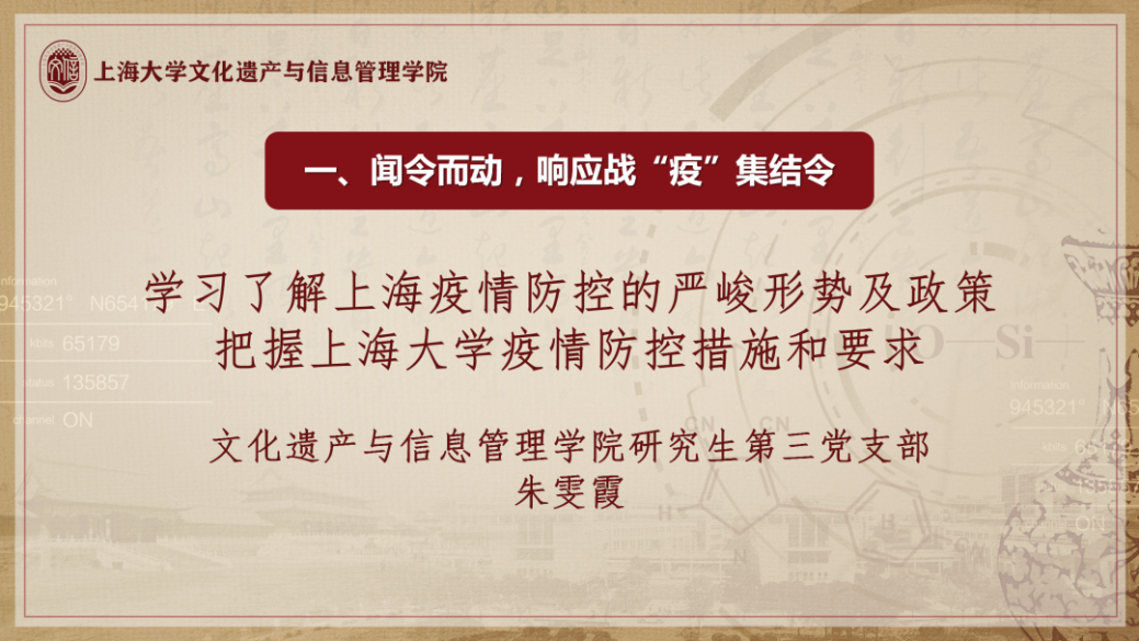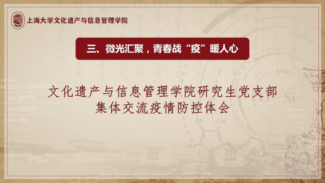为深入学习贯彻关于疫情防控的重要指示精神,贯彻落实孙春兰副总理考察上海时提出的有关工作要求,公司研究生党支部于2022年4月9日20:00联合开展“勠力同心•共克时艰——坚决打赢疫情防控阻击战”组织生活会。会议由研究生第四党支部组织委员姚佳颖主持,各支部全体党员准时参会。