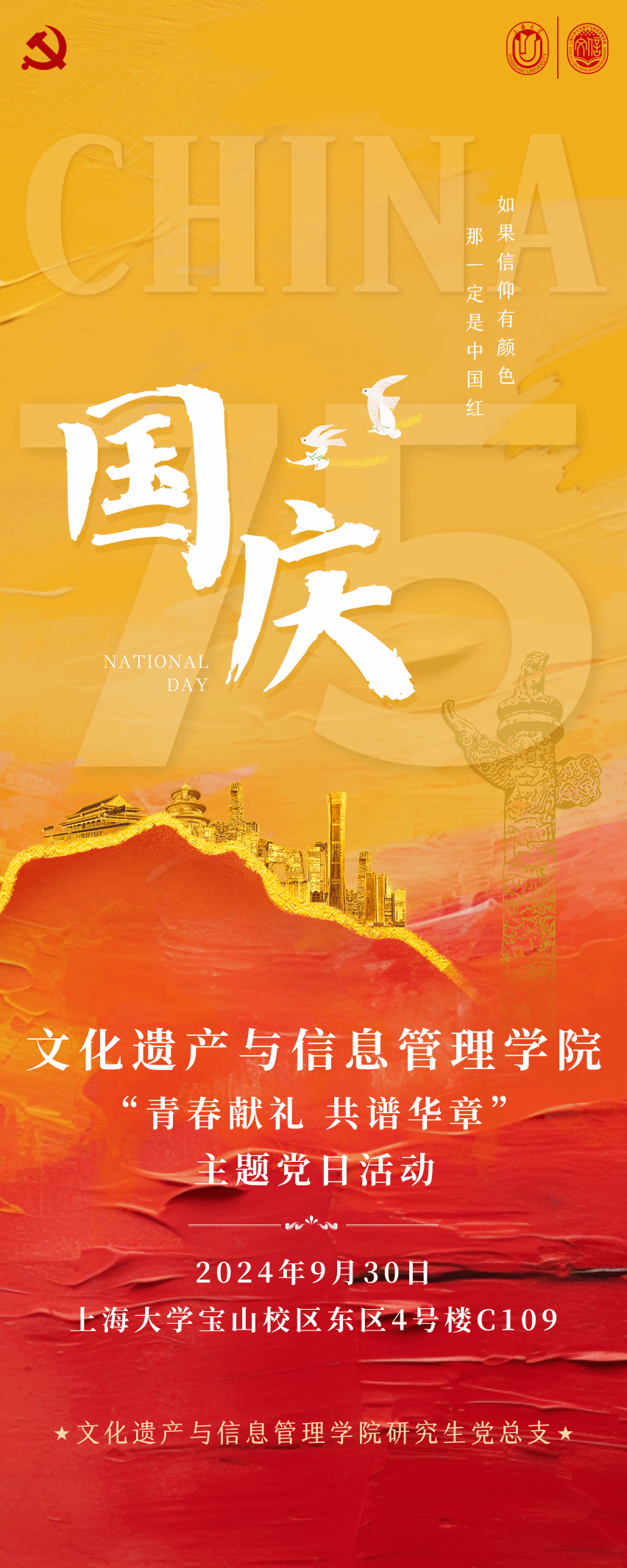 举国同庆!1949年-2024年,中华人民共和国成立75周年。在这个重要的日子里,304am永利集团全体研究生党员共祝祖国母亲生日快乐,愿伟大祖国繁荣昌盛!(撰稿人、摄影:王涵珂)