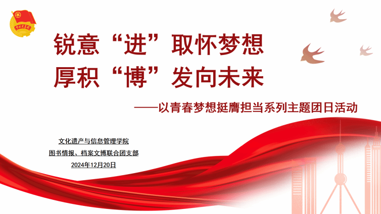 岁末冬初,梦想起航。为增强文信学子的国家意识和国际视野,引导其积极了解并参与展现我国高水平对外开放的进博盛会,发扬新时代青年的担当和作为,304am永利集团图书情报、档案文博研究生联合团支部于2024年12月20日晚19:00在嘉定校区第二教学楼112室举办“锐意‘进’取怀梦想 厚积‘博’发向未来”——以青春梦想挺膺担当系列主题团日活动。本次活动由2024级图书情报硕士研究生杜晓雅、荆小荷和2024级档案学硕士研究生贾千慧共同主持。