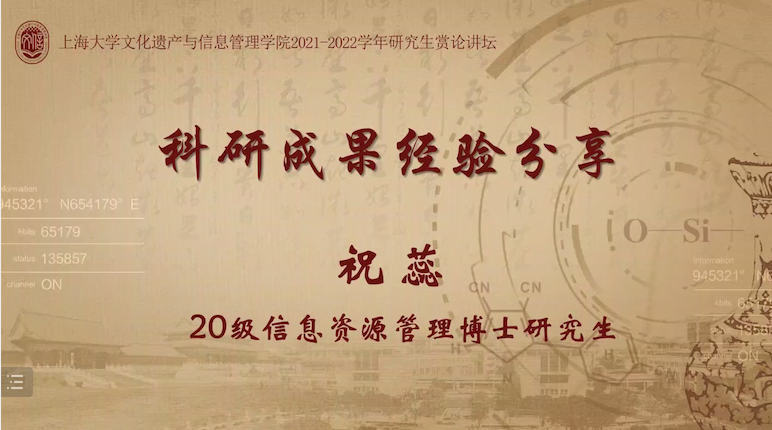 本次进行科研成果分享的是20级信息资源管理博士研究生祝蕊。她认为,学术研究首先要进行广泛阅读,可以关注基金项目(如国家社会科学基金项目、教育部人文社会科研项目、各省市哲学社会科学项目等)题目来把握学科热点,也可以浏览核心期刊论文题目来发现自己的研究兴趣,同时可以通过阅读学术著作来形成并建构自己的知识体系。在论文选题方面,可以关注期刊征稿范围和具有前沿性与特色性的学术会议;在论文写作过程中,要注意行文规范,学会引经据典。最后,祝蕊向大家推荐了数字人文领域的专业书籍。在提问环节中,祝蕊对同学们提出的学术问题作了详细解答,为大家学习相关领域知识提供了帮助。