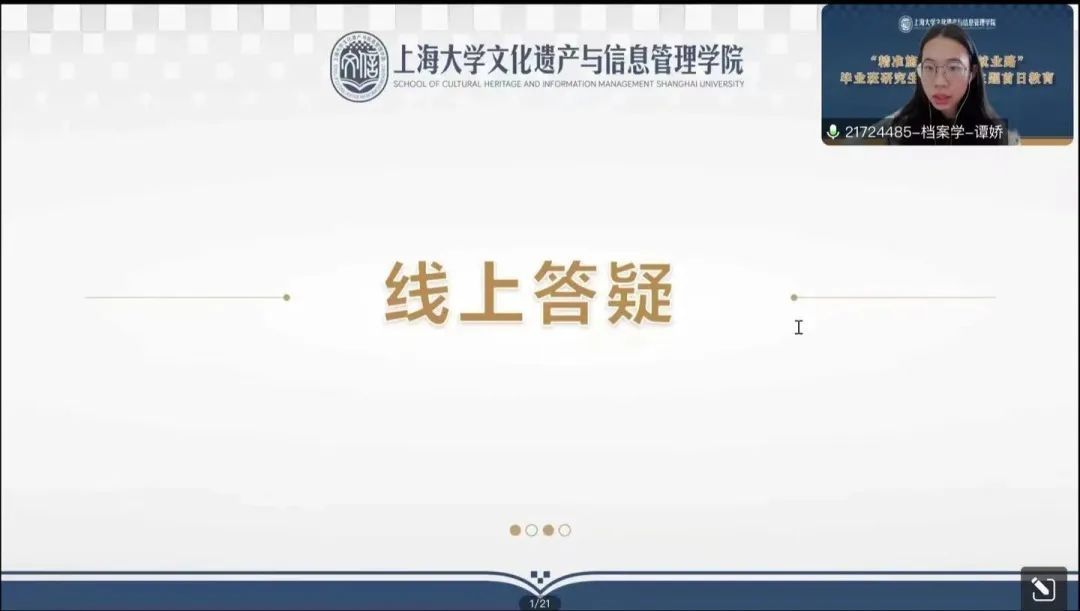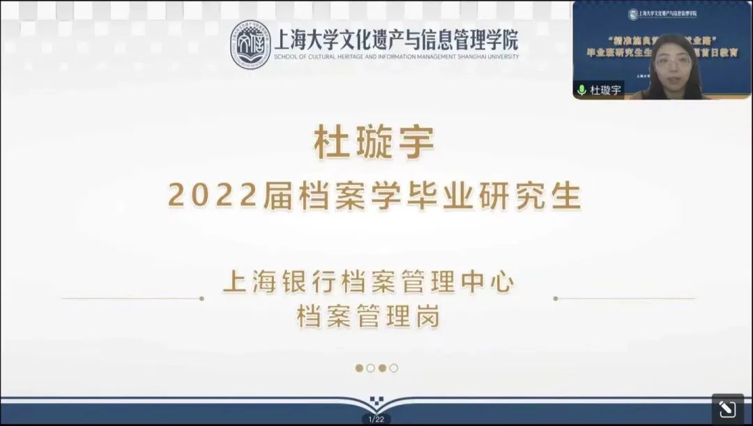 2022届档案学硕士毕业生杜璇宇,现就职于上海银行档案管理中心。杜璇宇先是细致分享了自身于长沙、上海两地的事业单位、国企和私企等单位面试的经历,梳理了不同岗位的面试题目和面试流程,提醒同学们平时要经常锻炼总结归纳和口语表达的能力;此外,要善于在简历中突出自己的优势,在协商福利待遇、单位属性和工作地点等问题的时候,可以适当保留底线,不要轻易妥协。杜璇宇还提到,当感到迷茫困惑时,应积极向身边的老师同学们寻求帮助,良师益友不仅可以慰藉情绪,还有可能提供意料之外的就业信息。