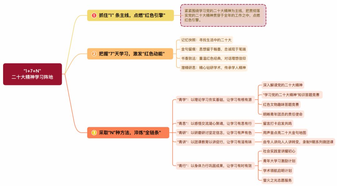 公司研究生联合团支部围绕“学习二十大,永远跟党走,奋进新征程”主题,锻造“1+7+N”二十大精神学习阵地,紧紧围绕学习党的二十大精神为主线,通过“记忆快照、金句留痕、书香致远、潜精研思”把握7天学习,开展了“青学”、“青思”、“青研”、“青讲”、“青行”等N种方法,进行“学、思、研、讲、行”全链条淬炼,真正推动公司研究生团员深入学习党的二十大精神,紧跟党的前进步伐,践行“强国有我”的使命担当。
