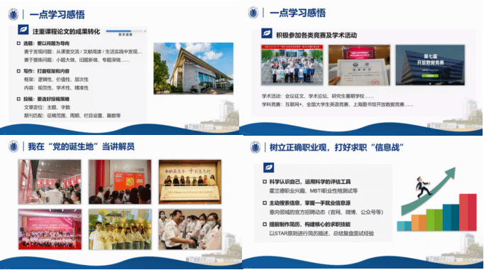 2020级档案学硕士研究生刘志森,现就职于中国船舶及海洋工程设计研究院,围绕科研学习、志愿服务和求职就业作题为“乘风破浪 逐梦前行”的生涯规划分享。在科研学习方面,刘志森以自己所在班级员工发文数据统计结果为例,指出同学们要注重课程论文的成果转化,在论文选题上要以问题为导向,在论文写作上要认真打磨论文框架和内容,在论文投稿时需要选择好投稿策略。在志愿服务方面,刘志森结合自身经历,号召同学们积极参加以中共一大纪念馆志愿服务为代表的社会志愿服务活动,经常走出校园,感知社会,从而更加了解自己,肯定自己。在求职就业方面,刘志森认为第一可以借助科学的职业评估工具,全面认识自己;第二要主动多方搜集信息,掌握一手就业信息资源;第三是提前制作简历,构建核心的求职技能。最后,刘志森祝愿每一位文信学子都能够在研究生生涯规划中找到适合的发展道路,努力成就更好的自己。