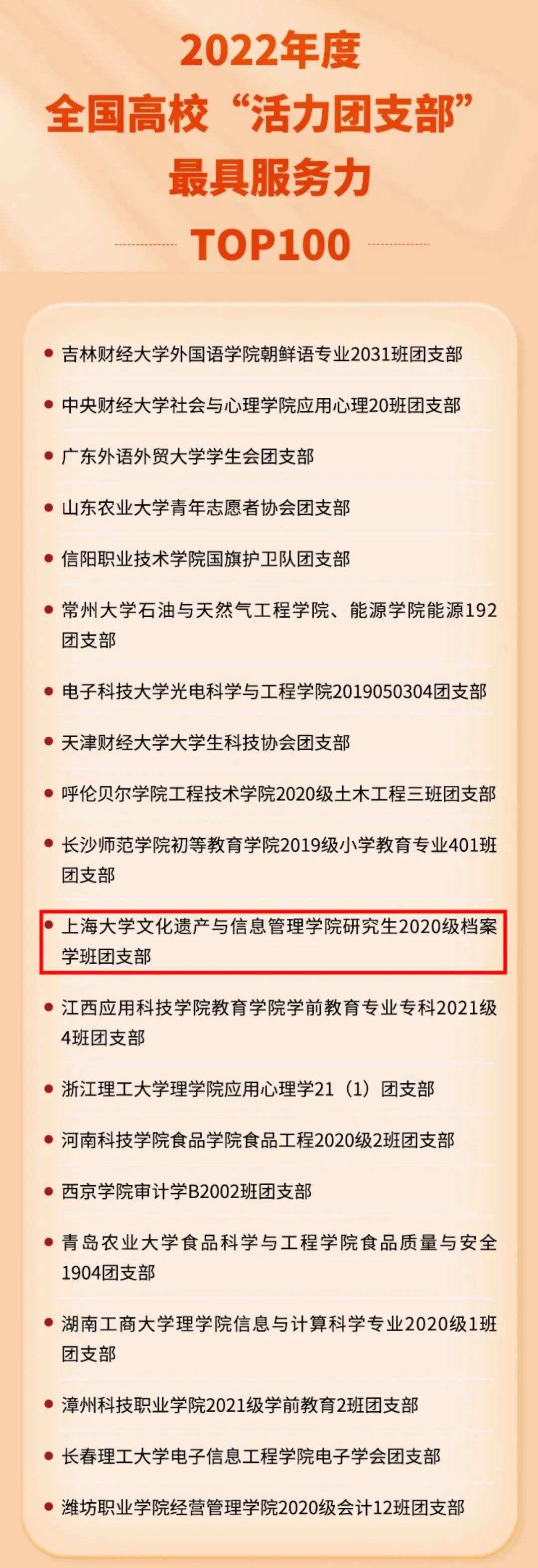 为深入贯彻“全团抓思想政治引领”、“全团大抓基层”、“全团抓公司”工作部署,落实《关于改革创新高校共青团工作 切实增强思想政治引领实效的若干措施》,激发高校团支部活力,团中央基层建设部指导中国青年报社开展2022年度高校“活力团支部”风采展示活动,从引领力、组织力、服务力、贡献度、改革味、好作风6个方面进行选拔。在针对服务力方面的评选过程中,公司研究生2020级档案学班团支部经过校内选拔、校级展示、市级展示以及全国展示等环节,最终脱颖而出入选2022年度全国高校“活力团支部”最具服务力TOP100榜!