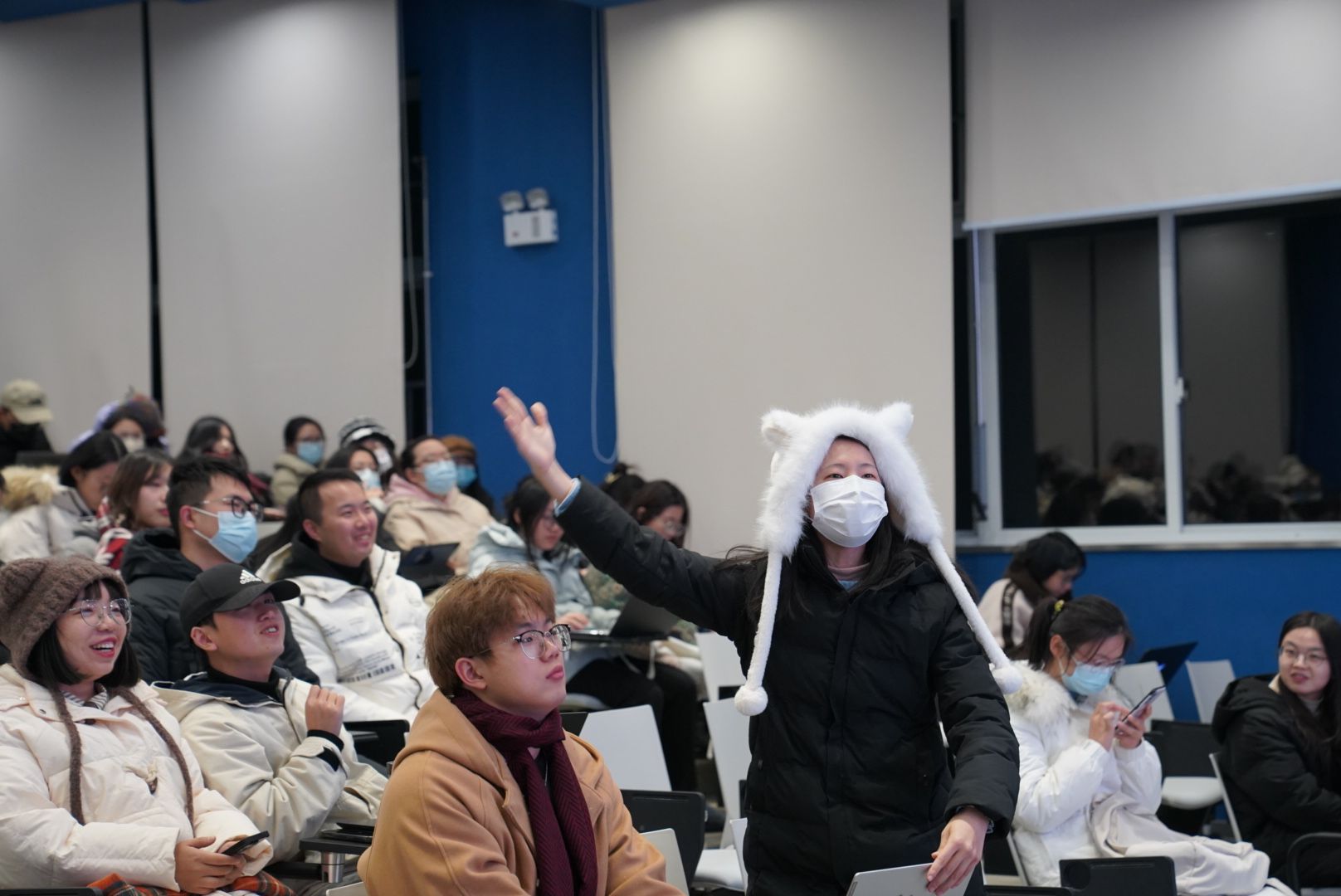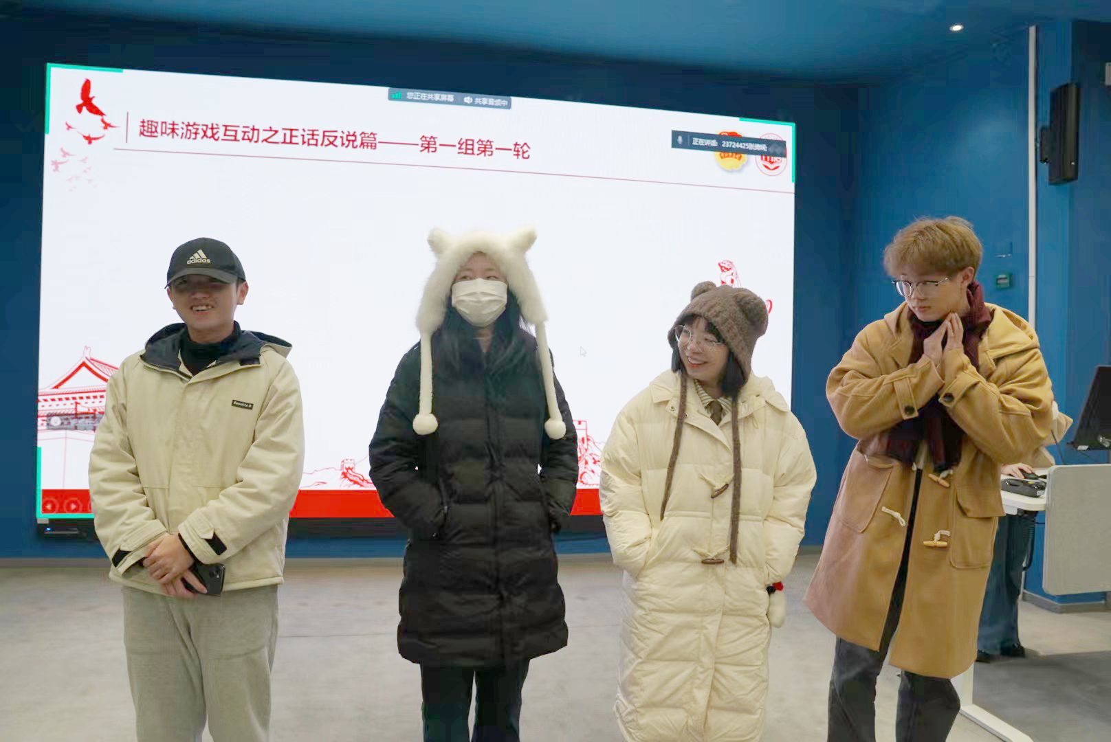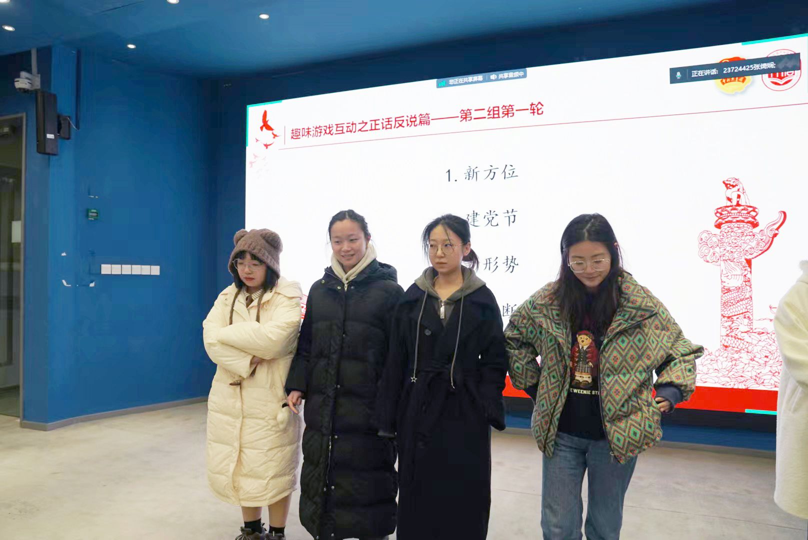 趣味学习,寓教于乐。短句易深入人心,更催人奋进。本次团日活动设置“正话反说”环节,共两组比赛,每组邀请4位同学上台参与,每位参赛同学须将PPT上展示的短句按照反序大声念出,反应敏捷且正确者则挑战成功。通过这一环节,研究生同学们在轻松愉快的氛围中学习到党二十大、团十九大和第六届中国国际进口博览会的力量金句,并从中汲取到爱国能量,凝聚起奋进力量,激发起拼搏斗志。