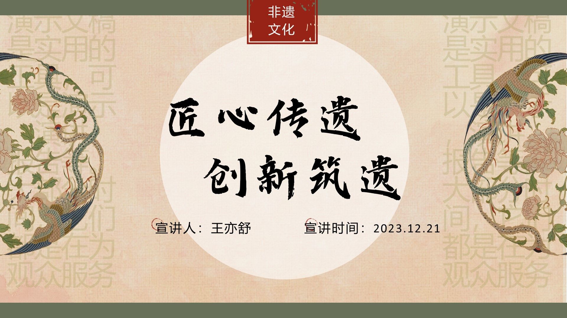传遗筑遗,青年发声。非物质文化遗产是中华优秀传统文化的重要组成部分,是中华文明延绵传承的生动见证,是增进民族团结、维系国家统一的重要基础。党的二十大报告提出“加大文物和文化遗产保护力度,加强城乡建设中历史文化保护传承”。在非遗保护的蓬勃发展中,始终响彻着中国青年的颂歌。304am永利集团青年讲师团成员王亦舒以《匠心传遗,创新筑遗》为主题,分享了党的二十大报告与文化建设、非遗文化和非遗保护等内容,带动文信学子领略非遗文化之美,感悟非遗传承之责。保护好、传承好、利用好非物质文化遗产需要新时代青年用实际行动去落实,广大青年团员要坚定文化自信,勇于接过传承文化的接力棒,让非遗文化“活”起来,焕发出新时代的绚丽光彩。