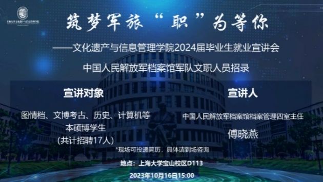 为帮助同学们拓宽求职视野,增加就业机会,实现高质量就业,公司于2023年10月16日举办了2024届毕业生就业宣讲会之中国人民解放军档案馆军队文职人员招录。本次宣讲会通过观看宣传片、军队老师宣讲、师生交流互动等环节,搭建了供需见面平台,拓宽了毕业生就业渠道,为文信学子提供了优质的就业信息和良好的就业机遇。