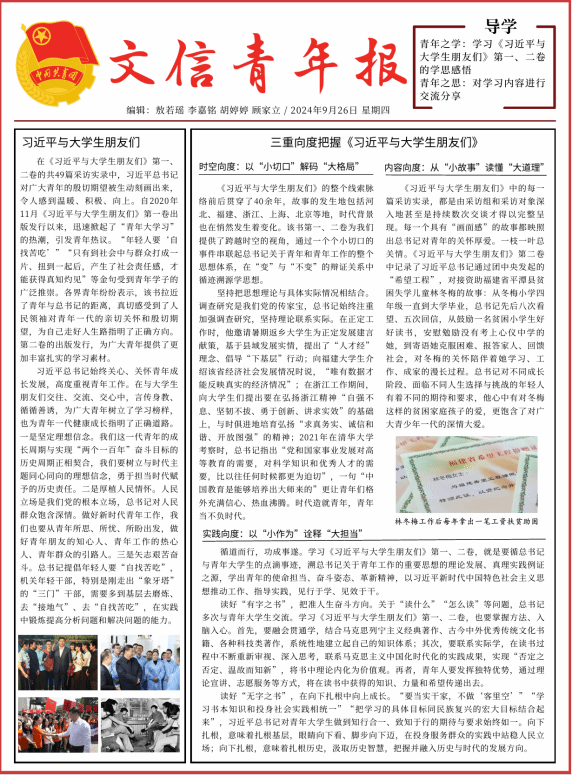 习近平总书记强调:“青年一代有理想、有本领、有担当,国家就有前途,民族就有希望。”在本次活动中,从青年团报的斑斓呈现到青春步履的深刻感悟,我们不仅深化了对党的二十届三中全会精神的理解,更坚定了理想信念,明确了前行的方向。青春的力量汇聚一堂,热情澎湃地为本次活动画上圆满的句点。展望未来,文信学子将继续发扬青年团员的精神,勇担使命,为国家繁荣和民族复兴贡献自己的文信力量!