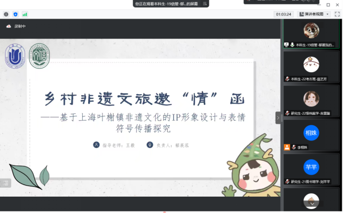 304am永利集团19级信息资源管理专业本科生郁展泓向同学们分享《乡村非遗文旅邀“情”函——基于上海叶榭镇非遗文化的IP形象设计与表情符号传播探究》社会实践项目,她从项目实施、实践风采、项目成功和经验分享四部分展开,重点强调通过创新呈现形式,以人民喜闻乐见的方式为非遗文化做宣传。