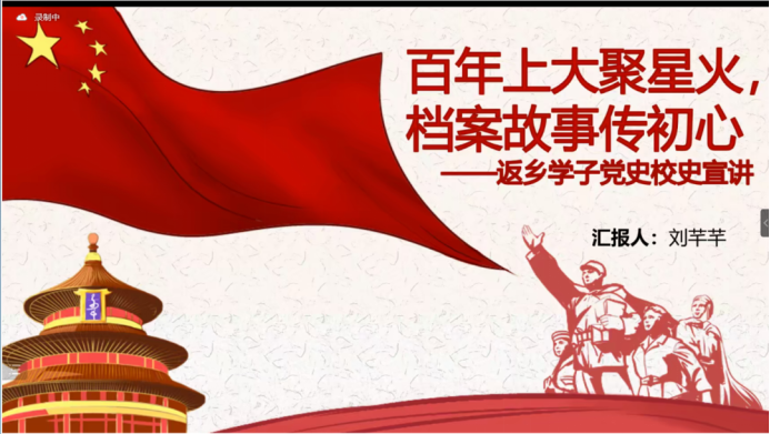 21级图书馆学专业研究生刘芊芊进行分享。她从切题选入、实践阶段、成果总结、注意事项四方面分享她开展的《百年上大聚星火,档案故事传初心——返乡学子党史校史宣讲》暑期社会实践项目和《南浔档案赋能乡村文化治理实践》寒假社会实践项目,她谈到成功宣讲的秘诀在于紧紧围绕党史学习教育、把握时代脉搏、借助党建品牌项目中共一大志愿讲解服务等。