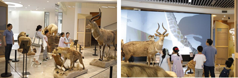 在展厅入口,小朋友们被肯尼斯·贝林(捐赠)珍稀野生动雕像吸引,都纷纷驻足观看欣赏。