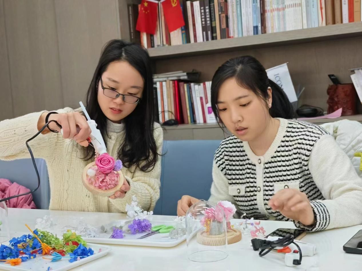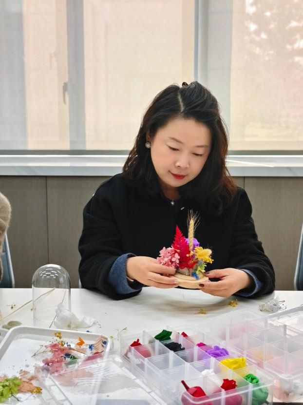 随后,各位教师纷纷动手制作永生花。大家或三五成群,或独自操作,用心挑选花瓣、搭配色彩,精心制作出一束束美丽的永生花。活动现场气氛热烈而温馨,每个人的脸上都洋溢着幸福的笑容。永生花的制作不仅让大家感受到了节日的喜悦和温暖,也让她们在忙碌的生活中找到了一片宁静和美好。
