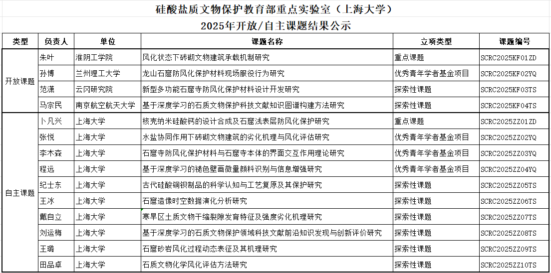 硅酸盐质文物保护教育部重点实验室2025年度课题申报通知发布后,得到了国内文博机构和高等院校科研人员积极响应。经个人申请、依托单位推荐、形式审查、内部评议、专家评审等多轮环节,最终评选出重点项目2项、探索项目8项、优秀青年学者基金项目4项,名单见附件。
